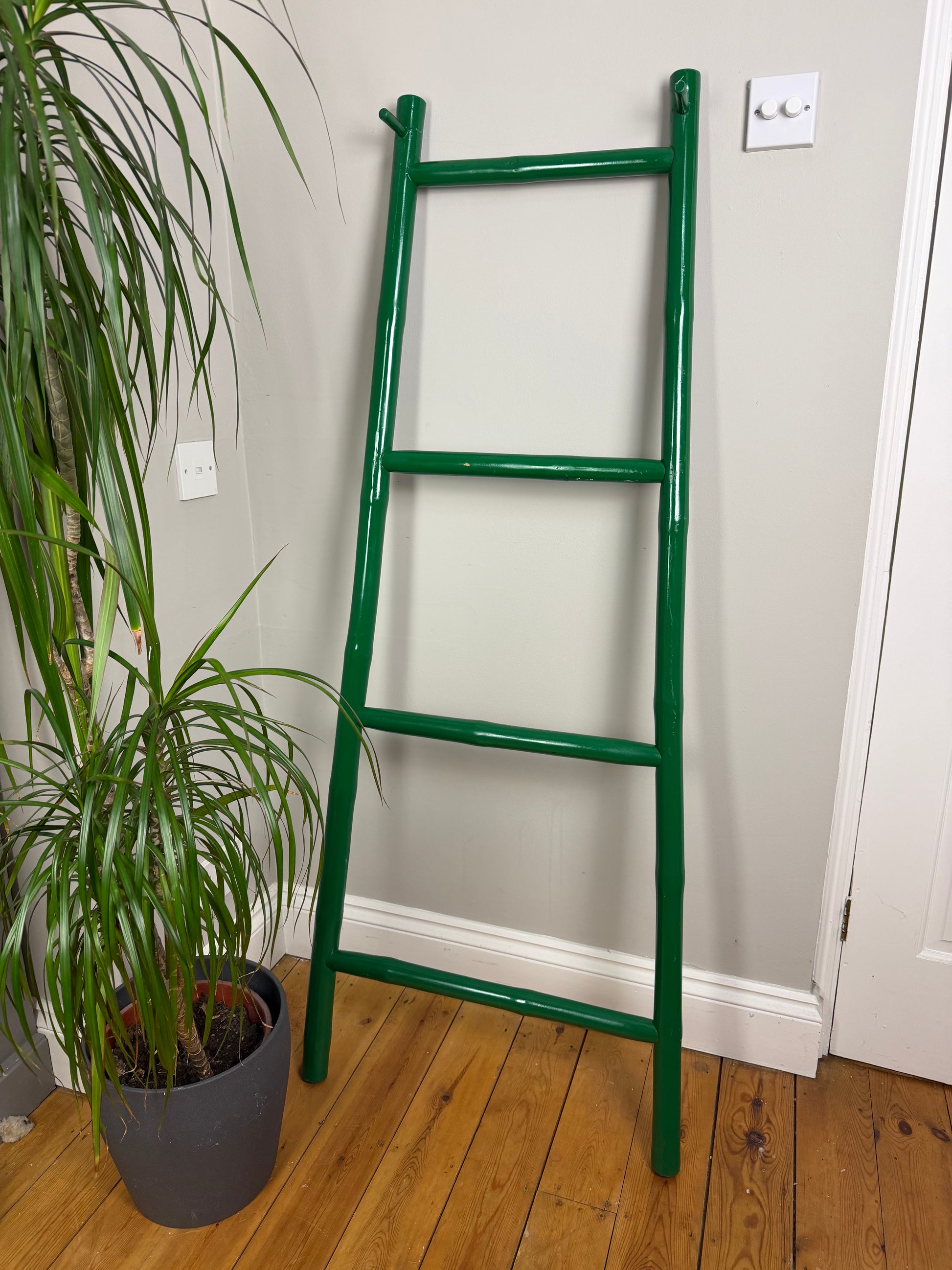 A stunning painted bamboo wooden ladder. Ideal for use as a decorative feature for displaying or used for hanging towels and clothes in a bathroom or bedroom.